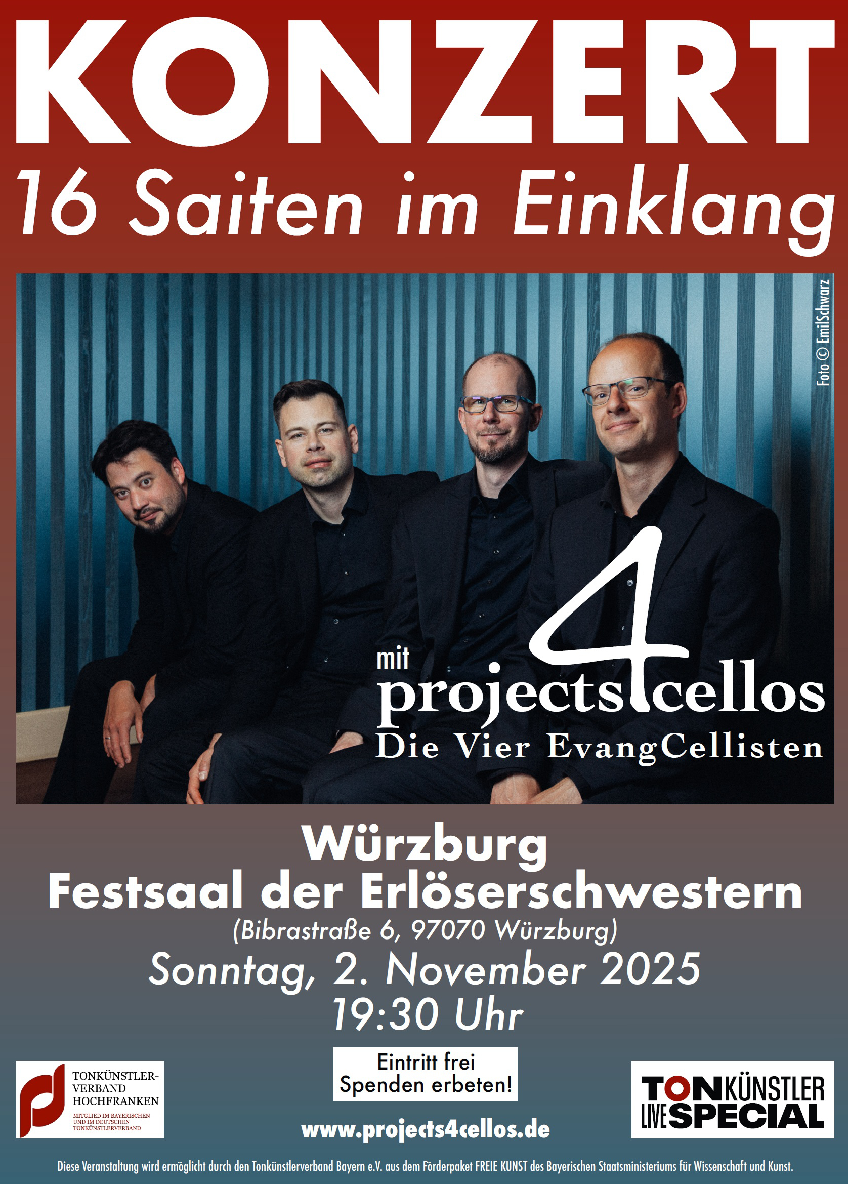 Das voraussichtlich letzte Konzert für dieses Jahr führt das Ensemble nach Würzburg. Im Festsaal der Erlöserschwestern (Bibrastraße 6, 97070 Würzburg) erklingt ein weiteres Mal das Programm "16 Saiten im Einklang". Projects4cellos beginnt sein Konzert am 2. November 2025 um 19:30 Uhr. Der Festsaal liegt im Zentrum der schönen Stadt. Der Eintritt ist frei, Spenden erwünscht. Es handelt sich nochmals um eine Veranstaltung der Reihe "Tonkünstler Live Special" des Tonkünstlerverbandes Bayern e.V., die vom Tonkünstlerverband Hochfranken e.V. unterstützt wird. Diese Veranstaltung wurde ermöglicht durch den Tonkünstlerverband Bayern e.V. aus dem Förderpaket FREIE KUNST des Bayerischen Staatsministeriums für Wissenschaft und Kunst. Herzliche Einladung!